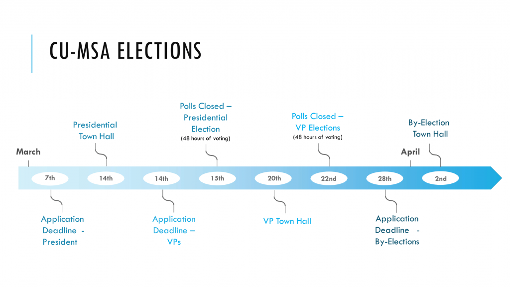 For more information regarding the Executive Body and the duties associated with each role, please see Article 5 of the CU-MSA Constitution attached here: CU-MSA Executive Duties